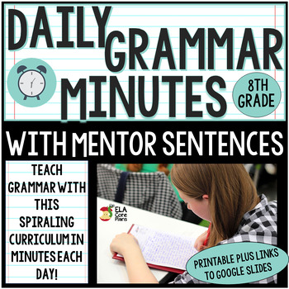 Use mentor sentences to easily teach mini grammar lessons in minutes each day! This 8th grade daily grammar mini lesson ELA resource can help you teach 8th grade Common Core language standards and can be used as a bell ringer for your mini lessons each day.
